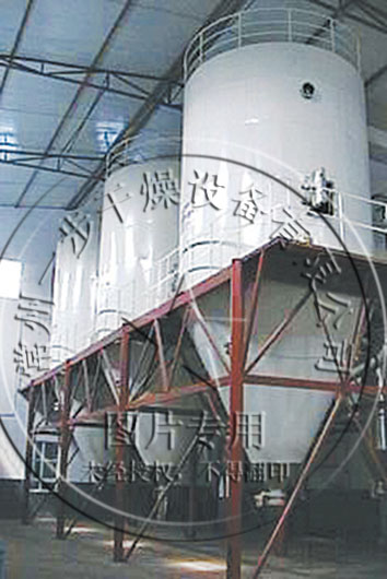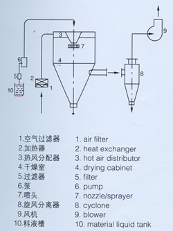 空氣經(jīng)過濾和加熱,進(jìn)入干燥器頂部空氣分配器,熱空氣呈螺旋狀均勻地進(jìn)入干燥室。料液經(jīng)塔體頂部的高速離心霧化器,(旋轉(zhuǎn))噴霧成極細(xì)微的霧狀液珠,與熱空氣并流接觸在極短的時間內(nèi)可干燥為成品。成品連續(xù)地由干燥塔底部和旋風(fēng)分離器中輸出,廢氣由風(fēng)機排空。